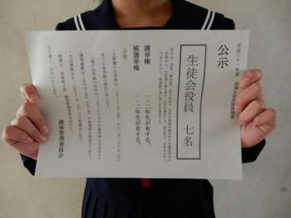 平成31年度 前期生徒会役員選挙 公示 公開日 2019/02/14 更新日 2019/02/14 職員室から 選挙管理委員会より平成31年度前期生徒会役員選挙の公示が行われました。生徒会役員は7名。立候補の受付は22日から。3月12日の立会演説会を経て、投票となります。中部中学校の中心となり活動したいと思っている人は、立候補してみませんか。