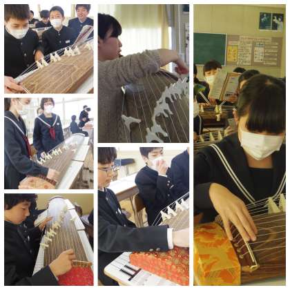 箏 公開日 2019/03/14 更新日 2019/03/14 校長室から 一人ずつ箏爪をつけて、「さくらさくら」に挑戦です。 「7 7 8 〇 、7 7 8 〇」で「さくらーさくらー」となります。 「箏の表現を味わいながら,音楽の特徴を生かして表現したり鑑賞したりしよう」 これがこの単元の目標ですね。 久しぶりに箱から出してもらえた箏たちも生徒に会えてうれしそうです。