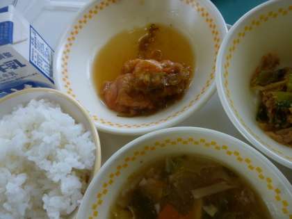 今日の給食 ラッキー7 白飯 鶏肉の南蛮だれかけ チンゲン菜の中華あえ 八宝湯 牛乳 合計777キロカロリー