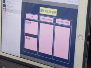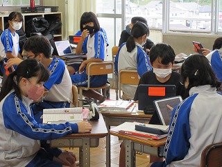 社会科では,ロイロノートを活用しています。 自分の考えをまとめ,級友と交流しています。
