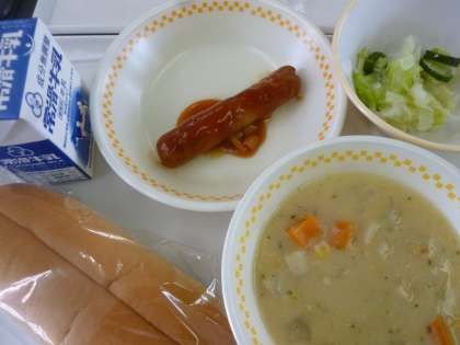 フランクフルト 公開日 2021/09/22 更新日 2021/09/22 職員室から 今日の給食 サンドイッチロールパン フランクフルトのきのこソースかけ コールスローサラダ コーンクリームスープ 牛乳 合計796キロカロリー