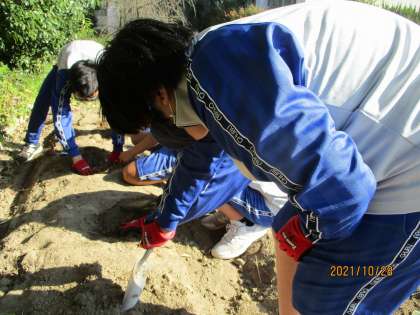 今日はいよいよさつまいもの収穫日です。みんなで期待と不安を胸に畑を掘り返します。
