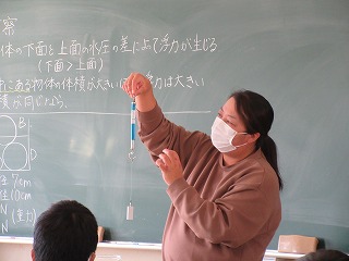 3年生の理科では、浮力について学習しています。 具体物を用いながら説明中です。