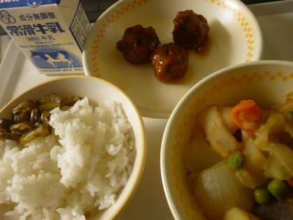 今日の給食 白飯 ★豆腐だんご 3個 肉じゃが きゅうり漬け 牛乳 合計733キロカロリー