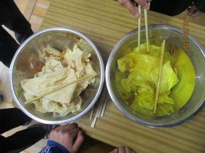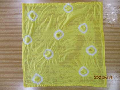 そしてできあがったハンカチは、肌色というか茶色というか黄色というか・・・微妙な色だな〜と思っていたら! ミョウバンを溶かした水につけた瞬間に、色がきれいな黄色に変わりました! みんな大喜びです(*^-^*)