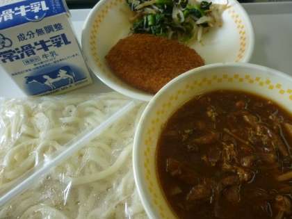 今日の給食 白玉うどん みそ煮込み風汁 コロッケ 小松菜のじゃこあえ 牛乳 合計802キロカロリー