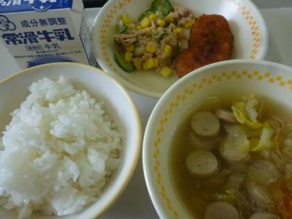今日の給食 白飯 三河赤鶏のチキンカツ ツナと大根のサラダ 冬野菜のスープ煮 牛乳 合計848キロカロリー