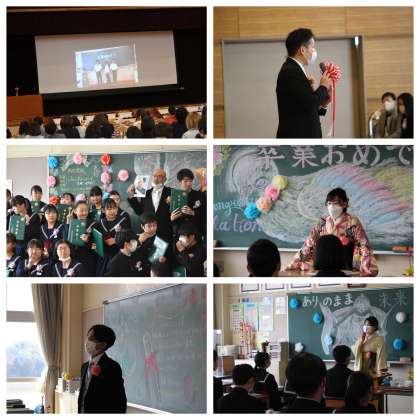主任から保護者の方々へのメッセージ 3年間の成長の様子をスライドにて 式後の各学級の様子