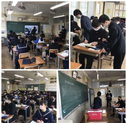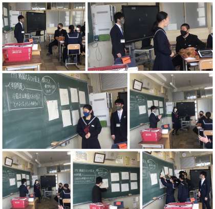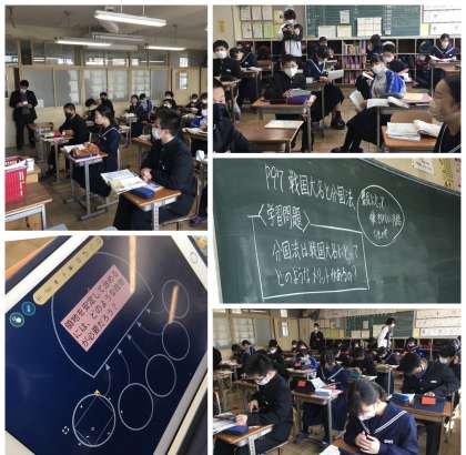 研究授業 分国法 公開日 2022/03/08 更新日 2022/03/08 職員室から 1年5組で社会科の研究授業が行われました。 戦国時代に領国を安定して治めるための方法を考えました。 その方法が分国法であることとつなげて考えている生徒が多くいました。 生徒は、日頃の授業の流れを感じさせる協働方法で学習問題を解決しようとしていました。 参観していた教員同士の話し合いをするなど、教員も日々研鑽を積んでいます。