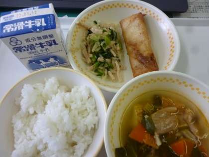今日の給食 白飯 愛知の野菜入り春巻き バンサンスー ピリ辛汁 牛乳 合計756キロカロリー