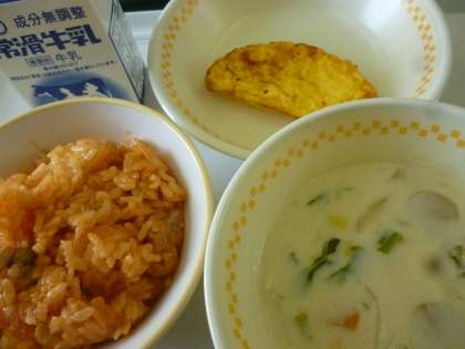 今日の給食 白飯 チキンライスの具 オムレツ 菜花のクリームスープ 牛乳 合計836キロカロリー