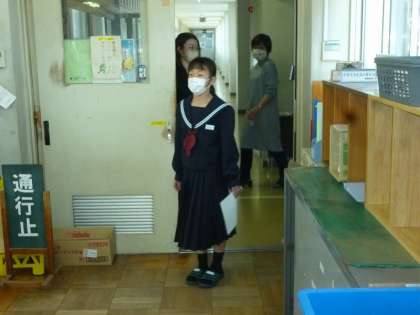 1年生が校内めぐりを行っていました。 職員室では入室の練習です。