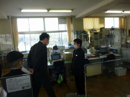 1年生が校内めぐりを行っていました。 職員室では入室の練習です。