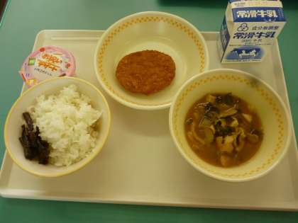 白飯 牛乳 キャベツ入りメンチカツ たまねぎのみそ汁 ふきの佃煮 お祝いいうちごゼリー