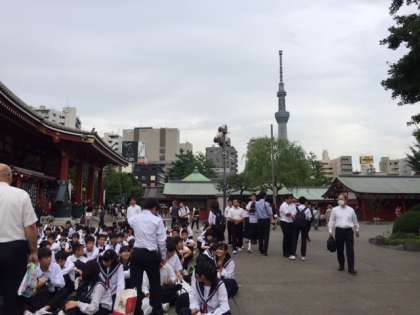 点呼完了! みんな無事に集まってきました。 東洋館に移動します。 後ろはスカイツリー