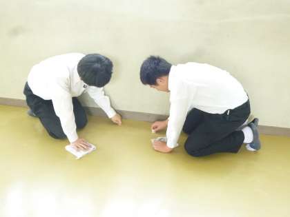 ゴミやほこりを取り、廊下を磨いています。