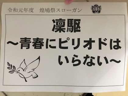 スローガン決定! 公開日 2019/07/05 更新日 2019/07/05 職員室から 本日、煌鳩祭のスローガンが決まりました。 今年のスローガンは 「凜駆 〜青春にピリオドはいらない〜」 10月18日(金)文化祭・19日(土)体育祭 本番に向けて、動き出しました。