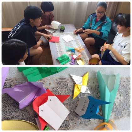 グループ交流は、けん玉と折り紙とフルーツバスケットです。