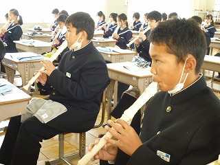 中学校で初めて習うアルトリコーダー。持ち方、姿勢から学習します。実際に音を出してみましたが、とてもきれいな音色でした。