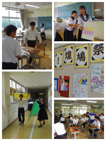 いよいよ 公開日 2019/10/17 更新日 2019/10/17 校長室から 煌鳩祭の前日となりました。 午後は、文化の部の準備が進んでいます。 明日は、天候にかかわらず8時45分からオープニングセレモニーを行います。 乞うご期待! 文化の部18日・体育の部19日・予備日24日(木)は、お弁当持ちとなります。 よろしくお願いします。