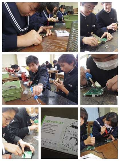 3年生技術科では、ラジオ製作 はんだごてを使って、回路を接着しています。 細かい作業です。集中力が違います!