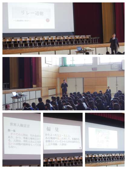 リレー道徳 公開日 2019/12/05 更新日 2019/12/05 校長室から 木曜4限は道徳の時間割 人権週間ですので、全校で「リレー道徳」を実施です。 前半を全校で、校長が講話と問題を提起する 後半は、各学級での対話で深める 校長から生徒へ、校長から先生へつなぐ「リレー道徳」 中部中が、人権感覚を磨く一時間となりました!