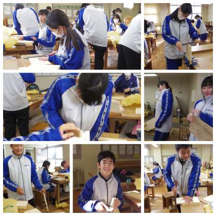 やすり 公開日 2020/01/10 更新日 2020/01/10 校長室から 1年生技術家庭科は、マルチラック制作中 木材の切断がおわり、やすりで磨くのに力が入ります。 この工程が仕上げを左右しますよ。