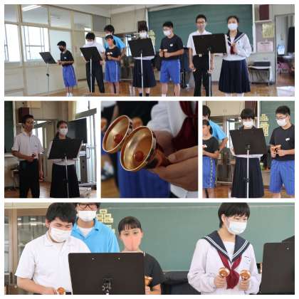 ベル 公開日 2020/07/31 更新日 2020/07/31 校長室から 今日の7・9組は大忙しの大活躍 2限は、音楽でハンドベルと歌のミニ音楽会 たくさんの先生方に聞いていただきました 午後は、「緑のカーテン」のゴーヤを収穫したので、それを使った夏カレーを調理実習しました!