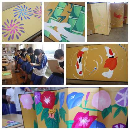2年生美術科 鑑賞会です 世界に一つだけの屏風の完成です 和を感じる力作がならんでいますね