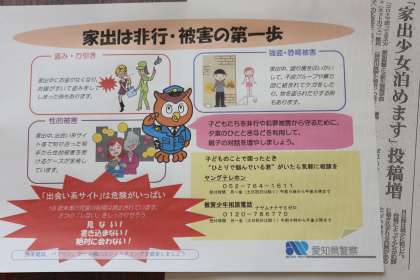 家出 公開日 2020/09/01 更新日 2020/09/01 校長室から 知多警察署スクールサポーターの方が来校されました コロナ禍で家出して、性犯罪の被害に遭う事件が多くなっているそうです 「出会い系サイト」と気づかず利用していることもあります 被害少年相談電話 0120-7867-70(なやむな なやみぜろ)(フリーダイヤル) または 052-764-1613(電話・FAX) 受付時間は、平日の午前9時から午後5時(祝日・年末年始を除く)