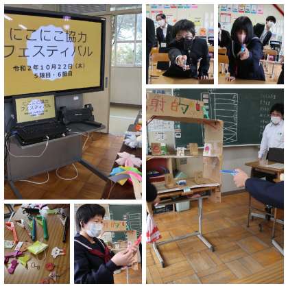 フェスティバル 公開日 2020/10/22 更新日 2020/10/22 校長室から 7組教室からは、歓声 「にこにこ協力フェスティバル」 今日のためにみんなで協力して製作していきました まずは射的コーナーで盛り上がっています 教育実習の先生方もお客さんですよ