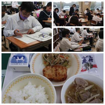 今日の給食 チキンの竜田揚げ ビーフン入り野菜炒め 乾燥小魚 765kcal