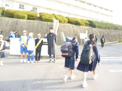 あいさつ運動最終日 公開日 2018/11/21 更新日 2018/11/21 職員室から あいさつ運動二日目。 今年度最後のあいさつ運動です。 生活委員会の生徒たちは、「人の顔を見て、きちんと伝わる声で、生活委員からあいさつすること」を目標に取り組んできました。 コミュニティーの皆様、PTA理事の皆様方にもご協力いただきました。感謝申し上げます。 あいさつはコミュニケーションの一歩。対人関係を円満にし、社会関係を円滑にします。これからも、自分から進んであいさつできるといいですね。