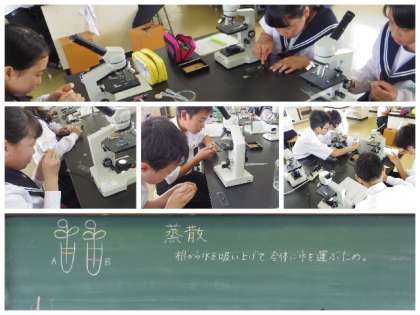 葉っぱを薄くめくって、プレパラートに載せて、気孔を顕微鏡で観察します。