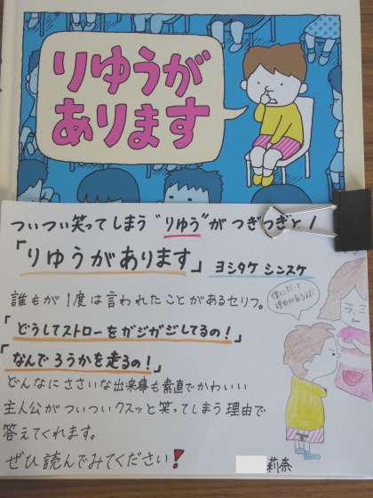 本のPOPシリーズ1 公開日 2018/12/17 更新日 2018/12/17 校長室から 本のポップ 本を読んだ人が、その本を読んだことのない人に、 その本の「何」に「どう」心を動かされたかを短いフレーズに思いを込めて伝えるもの 冬の読書の参考に 1年生の作品からシリーズ掲載開始 「りゆうがあります」