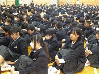 2、3年生の拍手の中、1年生が体育館に入場しました。