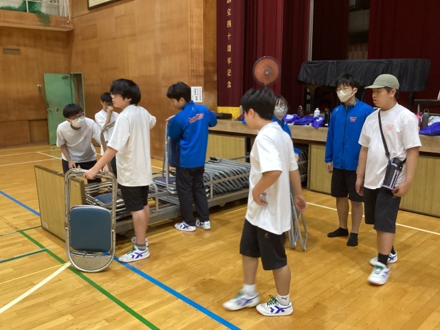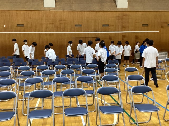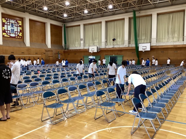 9/24 2年生会場準備 公開日 2025/09/24 更新日 2025/09/24 2年生 明日の合唱コンクール・秋華祭文化の部に向けて、2年生が会場の椅子並べをしていました。一つ一つ丁寧に並べる姿から、本番に向けた気持ちの高まりが伝わってきます。こうした裏方での準備があるおかげで、当日のステージがより充実したものになります。