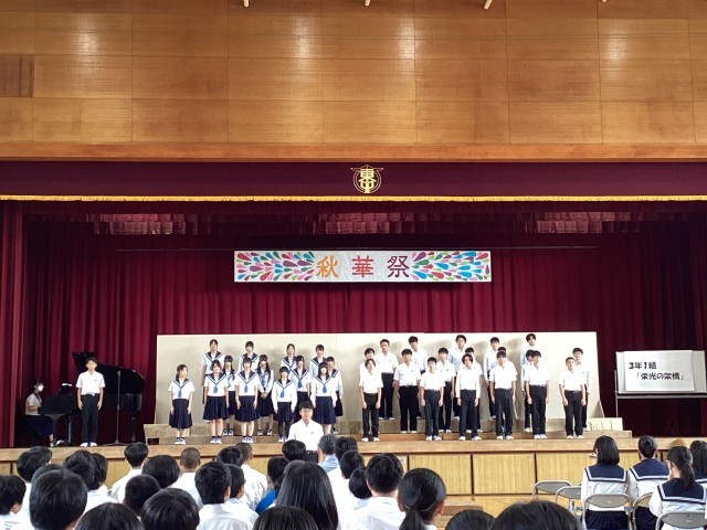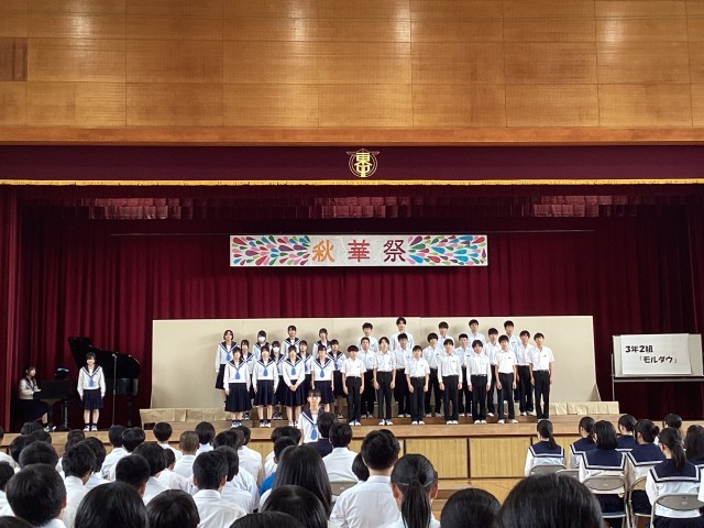 9/25 3年生合唱コンクール 公開日 2025/09/25 更新日 2025/09/25 学校行事 3年生の合唱の様子です。さすが3年生といえる迫力と深みのある歌声が響き渡り、会場全体を魅了していました。最上級生らしい気持ちのこもった合唱でした。