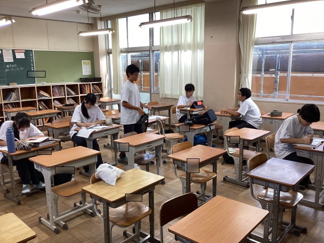 9/26 教育相談・自習室 公開日 2025/09/26 更新日 2025/09/26 東部中の様子 今日からテスト週間に入りました。各クラスでは教育相談が行われています。担任の先生と生徒が一対一で向き合い、最近の悩みや今後の目標について話し合っています。また、各学年では自習室を活用し、集中して学習に取り組む姿が見られました。