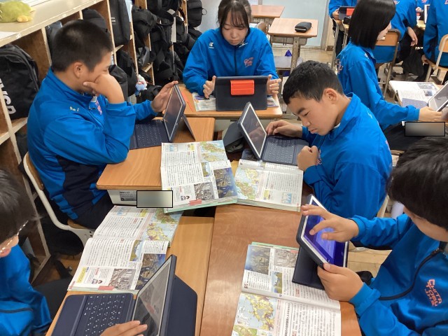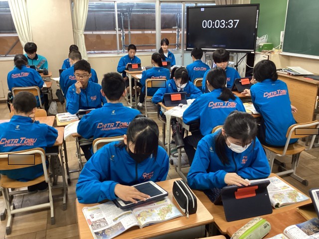 2年2組の社会では、「中部地方の自然環境と人々の関わり」について、グループで意見を出し合いながらまとめていました。