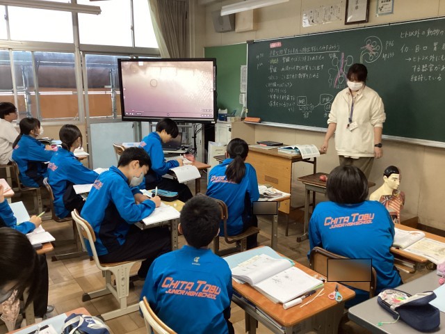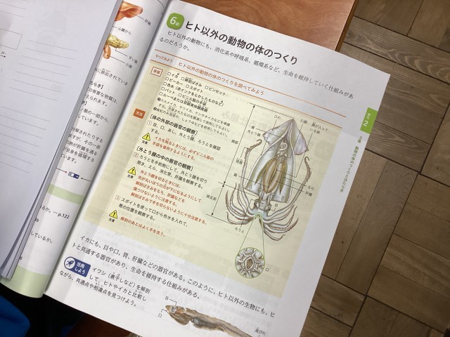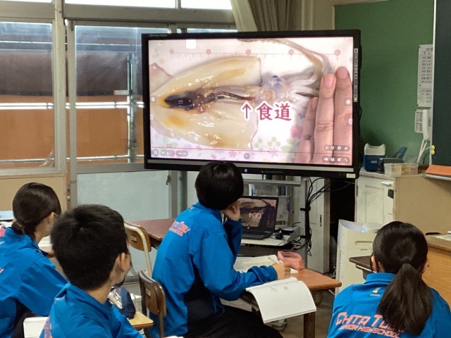2年1組の理科では、イカの体のつくりについて学習し、資料を見ながら理解を深めていました。