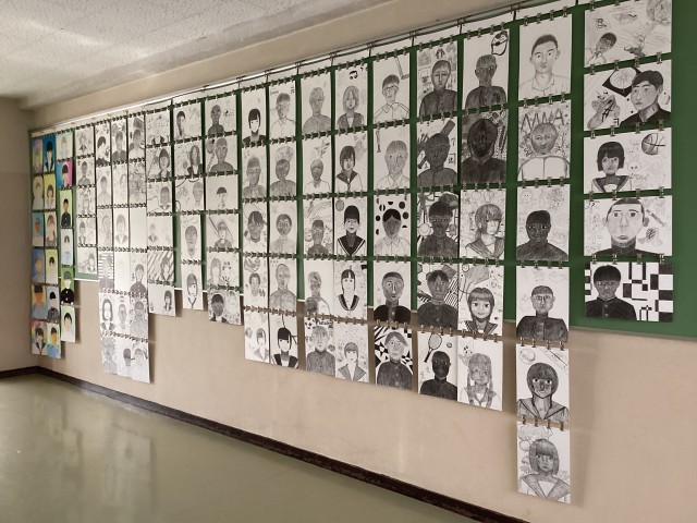 現在、体育館へ続く渡り廊下には、美術の授業で制作した自画像が展示されています。