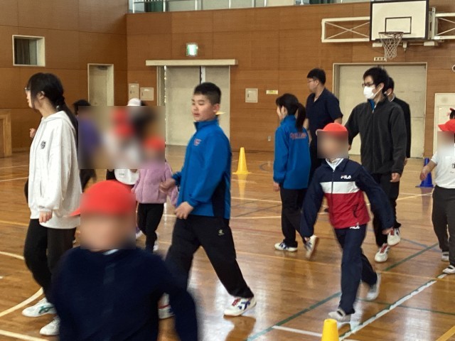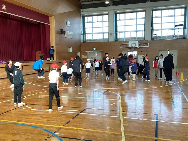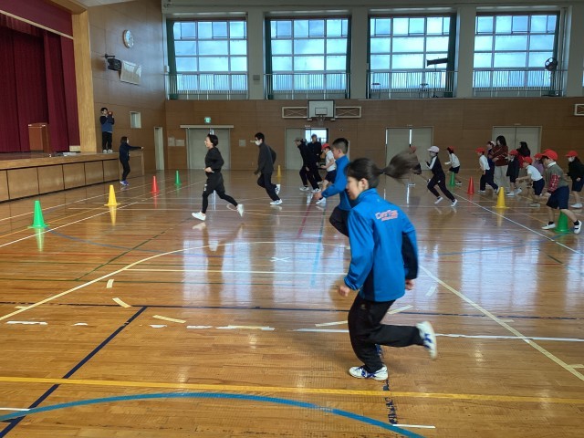 そのほかにも、縄跳びをくぐったりジャンプしたりする運動や、黄色と青色のマーカーをひっくり返すゲームなど、楽しみながらたくさん体を動かしました。最後は、音楽に合わせてダンスをしました。