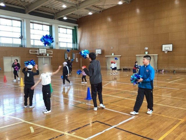 ストレッチで体をほぐした後、リズムに合わせた鬼ごっこや、ポンポンを使った動きづくり、走りながらさまざまな動きに挑戦しました。
