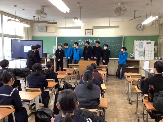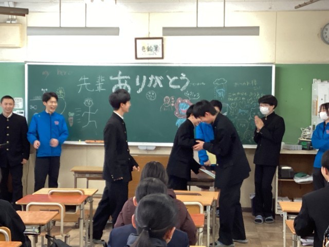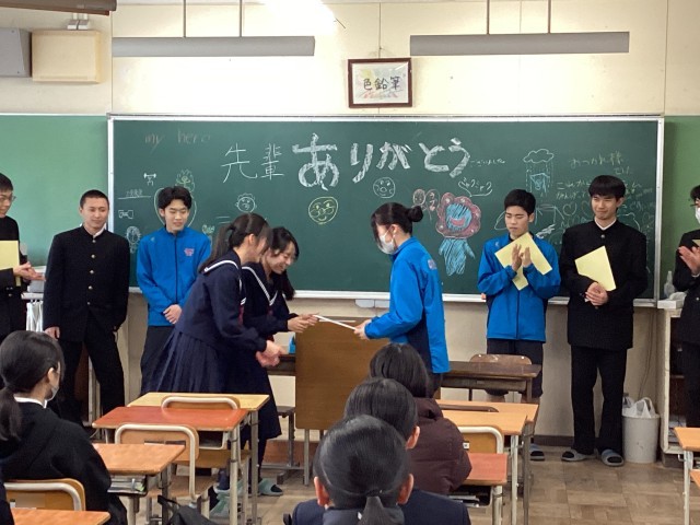 2/27 陸上部お別れ会 公開日 2026/02/27 更新日 2026/02/27 部活動 3年生の卒業まで、残り1週間となりました。陸上部では、3年生とのお別れ会を行いました。1・2年生が感謝の気持ちを込めて作成した色紙を、3年生へ贈りました。これまで共に練習に励んできた仲間との時間を振り返り、思わず涙を流す生徒の姿も見られました。最後は全員で記念写真を撮影し、思い出に残る温かいひとときとなりました。