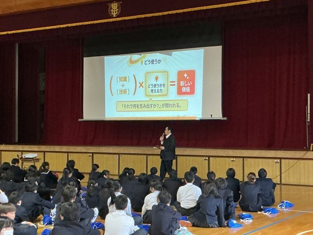 教務主任からは、校訓である「正義・忍耐・協力奉仕」と関連付けながら、今年度、東部中の生徒と先生が大切にしていきたいことについて話がありました。
