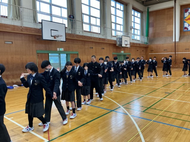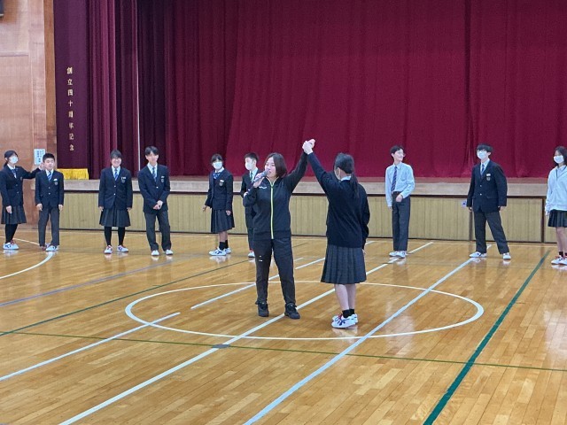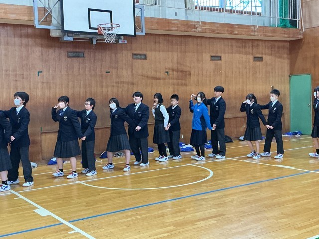 4/23 2年生 林間学校に向けて 公開日 2026/04/23 更新日 2026/04/23 2年生 体育館から楽しそうな声が響いてきました。覗いてみると、2年生が林間学校に向けたフォークダンスの練習を行っていました。最初は少し照れくさそうな表情を見せる生徒もいましたが、曲が始まると手を取り合い、笑顔でステップを踏んでいました。一人一人がリズムに乗りながら楽しそうに踊る姿に、学年の一体感が高まっているのを感じます。当日、大自然の中でみんなで踊る時間が今から楽しみです。