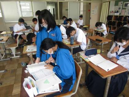 6/6 授業風景 公開日 2024/06/06 更新日 2024/06/06 東部中の様子 1年生の数学の演習問題では、計算過程を具体的に仲間に伝えながら前向きに取り組む生徒がたくさんいます。理科の授業では、自分と様々な種類の生き物との体のつくりや生活スタイルの違いを考えました。