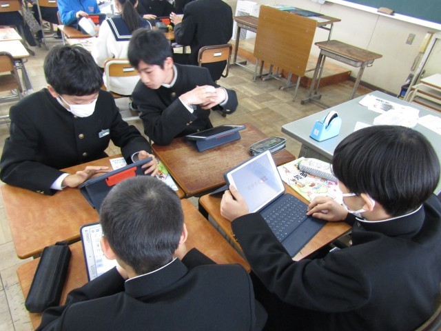 3/13 授業風景 公開日 2025/03/13 更新日 2025/03/13 東部中の様子 生徒は、タブレットを有効活用してアンケート用紙を作成したり、社会科のレポートを作成したりしています。より多くの級友の考えを共有するツールとして、各教科の様々な学習場面でタブレットを活用することが習慣となっています。 +3
