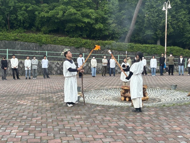 火の神から炎をいただき、キャンプファイヤースタート、まずはフォークダンス